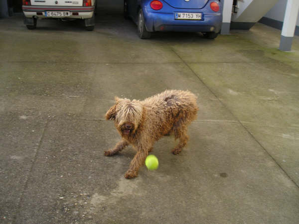 la pelota en la boca para que se la tire....